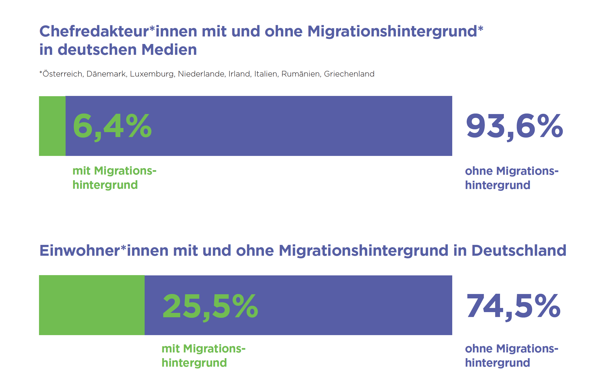 - Only 6 percent of editors-in-chief have a migrant background. Groups that are particularly affected by racism and discrimination are not represented among them (see chart in the appendix).