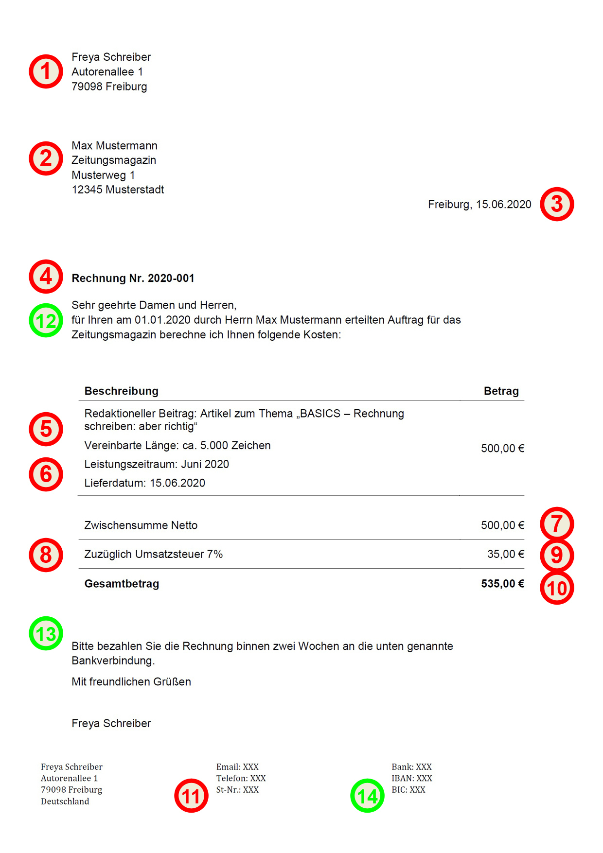 Damit freie Journalist*innen in Deutschland ihr Honorar erhalten, müssen sie eine Rechnung schreiben. Was in einer Rechnung alles enthalten sein muss, das regelt das Umsatzsteuergesetz (Paragraf 14 – Ausstellung von Rechnungen). Diese Pflichtangaben sind:
